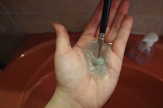 C’est assez simple. Un peu de shampoing sur le pinceau, je touille dans ma main puis je rince.