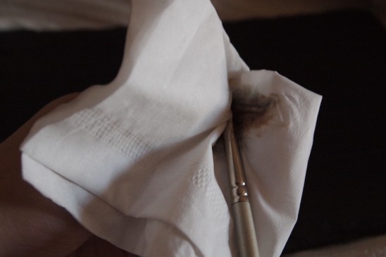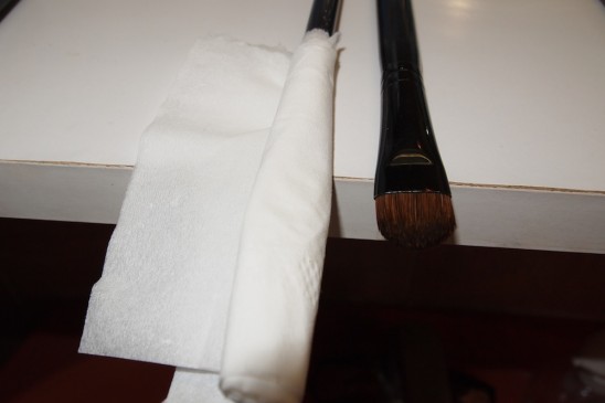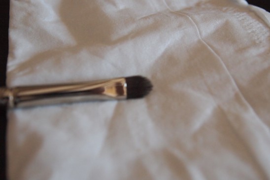 Lorsque vous avez utilisez un fard gras, il est nécessaire de préparer votre pinceau avant de le laver afin d’enlever la pellicule « grasse ». J’utilise du démaquillant waterproof. Le procédé est simple. Je trempe mon pinceau dans un peu de démaquillant et je frotte le tout dans un mouchoir.