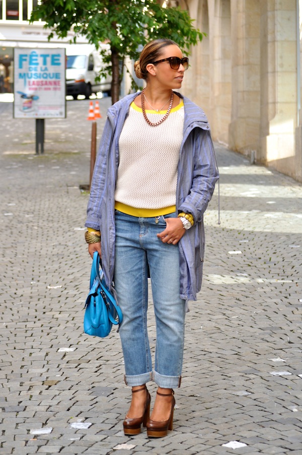 Je crois que la météo est claire : l’indispensable mode du moment c’est la parka d’été. Légère et avec une capuche elle protège des minis averses sans pour autant nous étouffer au premier rayon de soleil. Pour mon city-break à Lausanne j’ai choisi ce look citadin aux couleurs de la saison : jaune et bleu. Et c’est définitif le boyfriend et les chaussures avec un patin sont vraiment mes alliées.